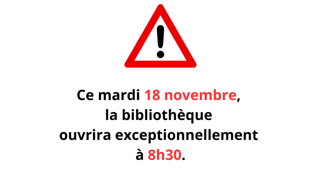 Ce mardi 18 novembre, la bibliothèque ouvrira exceptionnellement à 8h30.